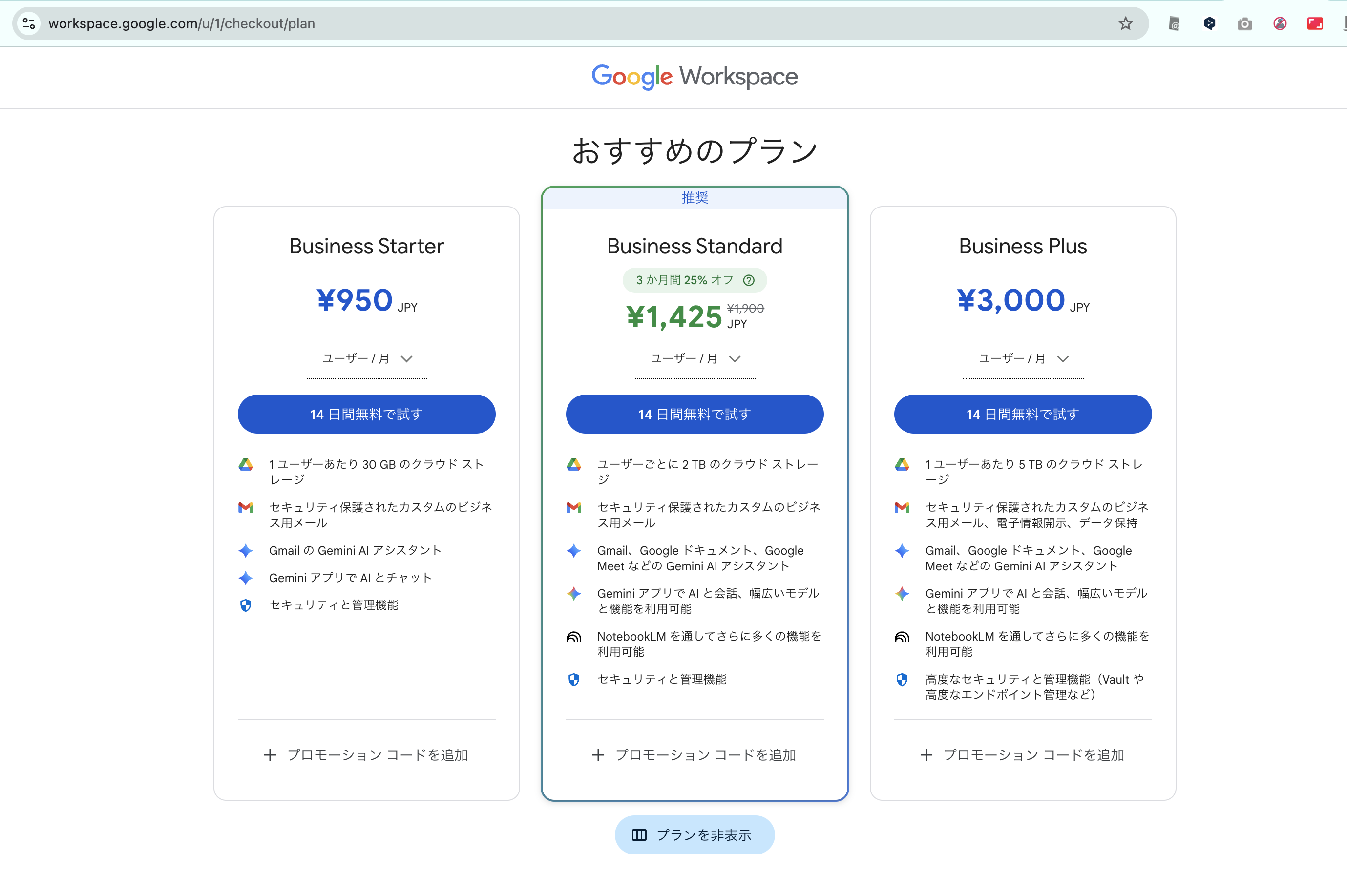 その後、サブドメインで作り直そうと思い、今度は既存のGoogleアカウントでログイン済みのChromeから飛んだところ、25%オフの別のオファーが表示された。