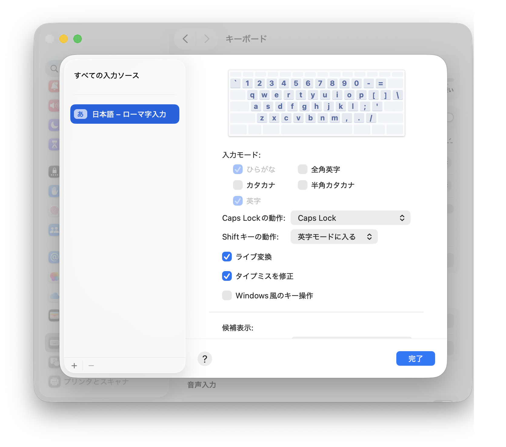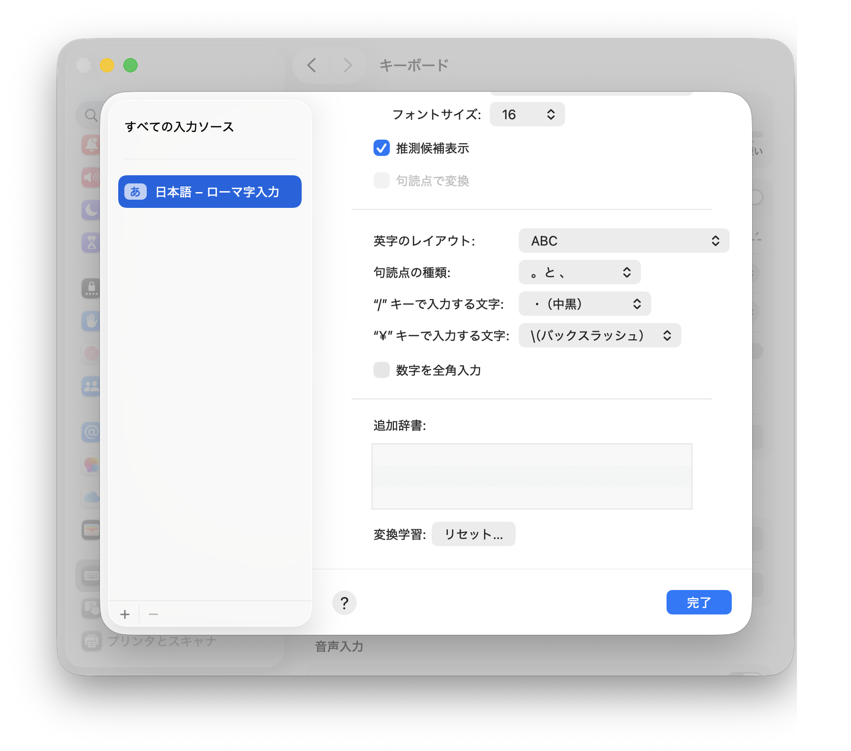 入力ソースが「日本語 - ローマ字入力」と「ABC」の両方が有効になっていた。